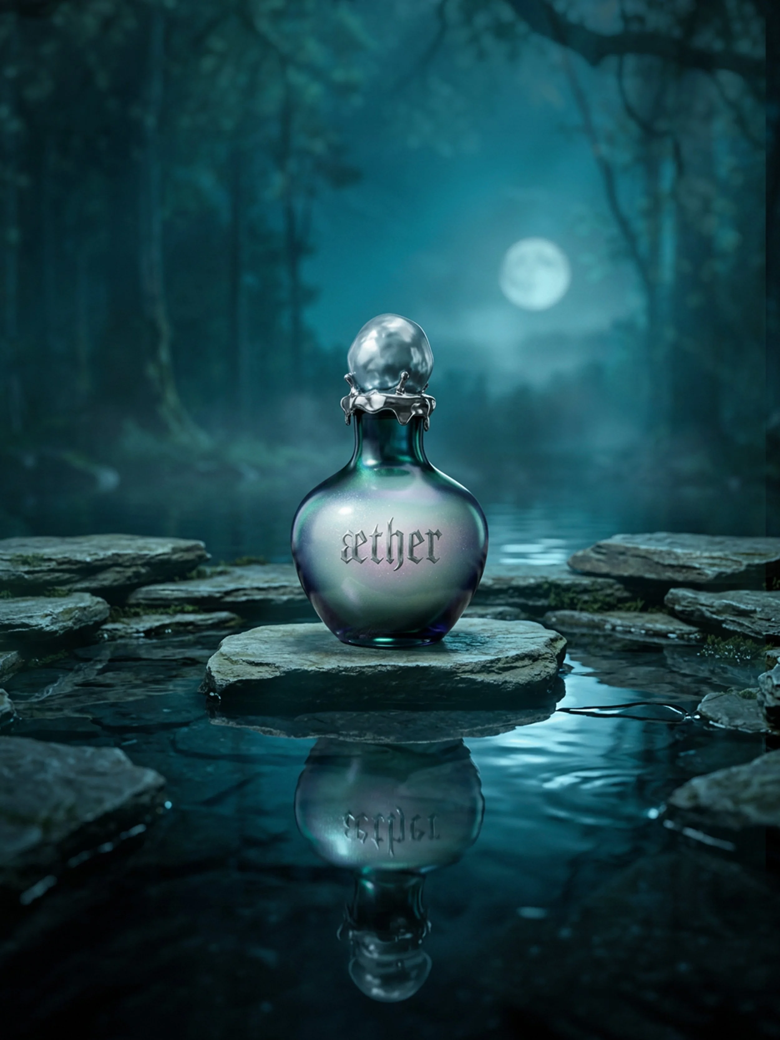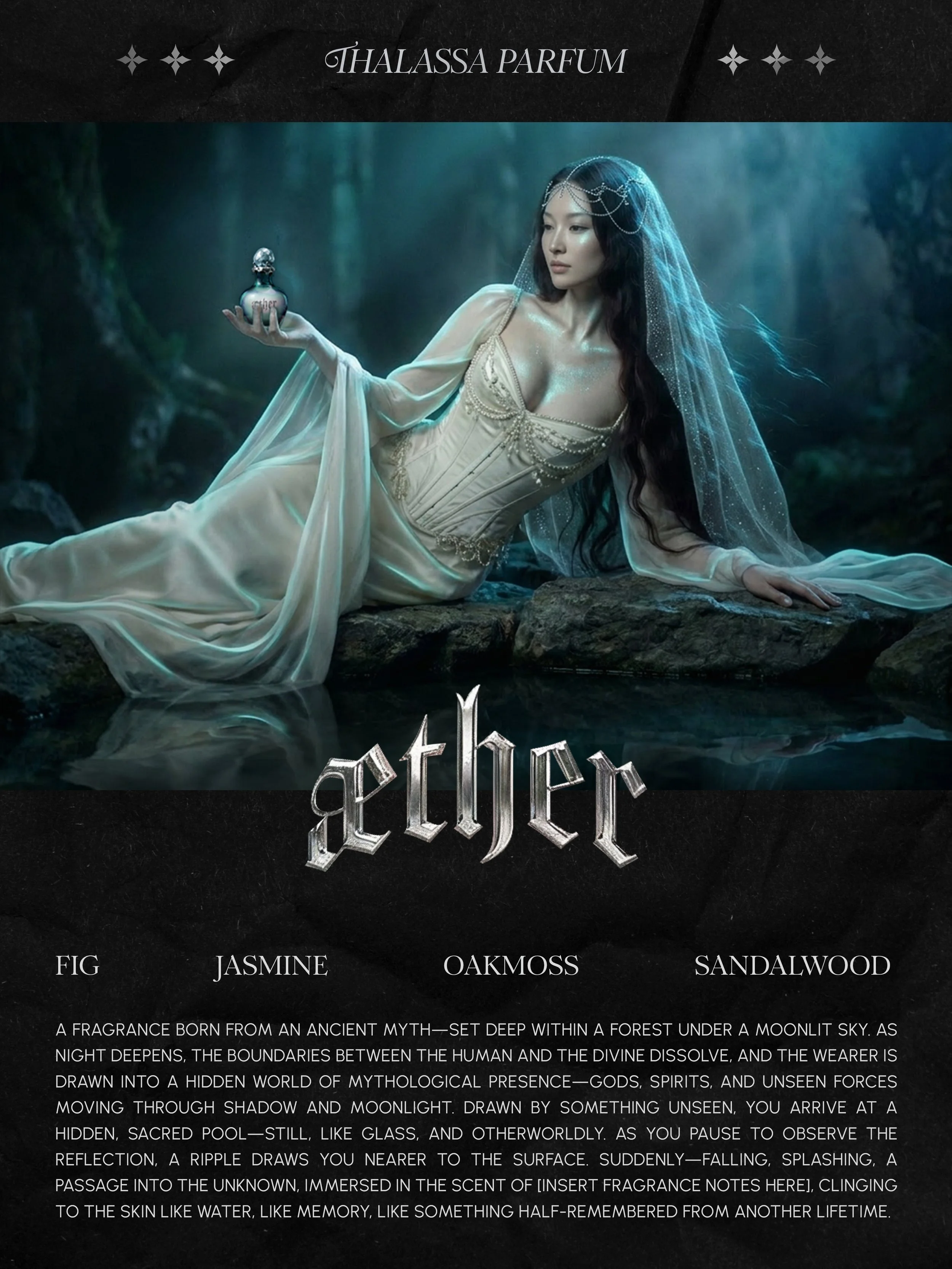 The brand is set within a mythic landscape—a hidden forest pool beneath a moonlit sky—where reflections, water, and light become central visual motifs. The identity system balances restraint and sensuality: refined typography, a minimal yet atmospheric palette, and a logo suite designed to feel both timeless and elusive.